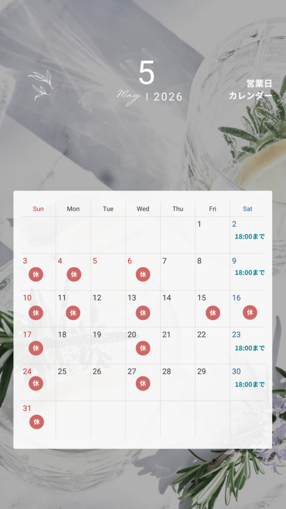 5月4日(月)お休み ※5月5日(火・祝日)は営業しております 2026 4/27 お知らせ 2026年4月27日 5月4日(月)お休み ※5月5日(火・祝日)は営業しております 5月11日(月)お休み 5月15日(金)お休み 5月16日(土)お休み お知らせ よかったらシェアしてね! URLをコピーしました! URLをコピーしました!